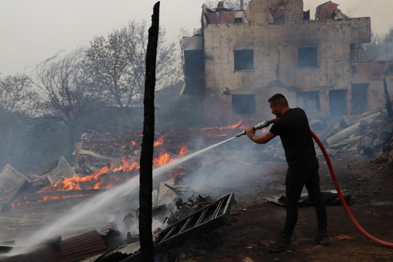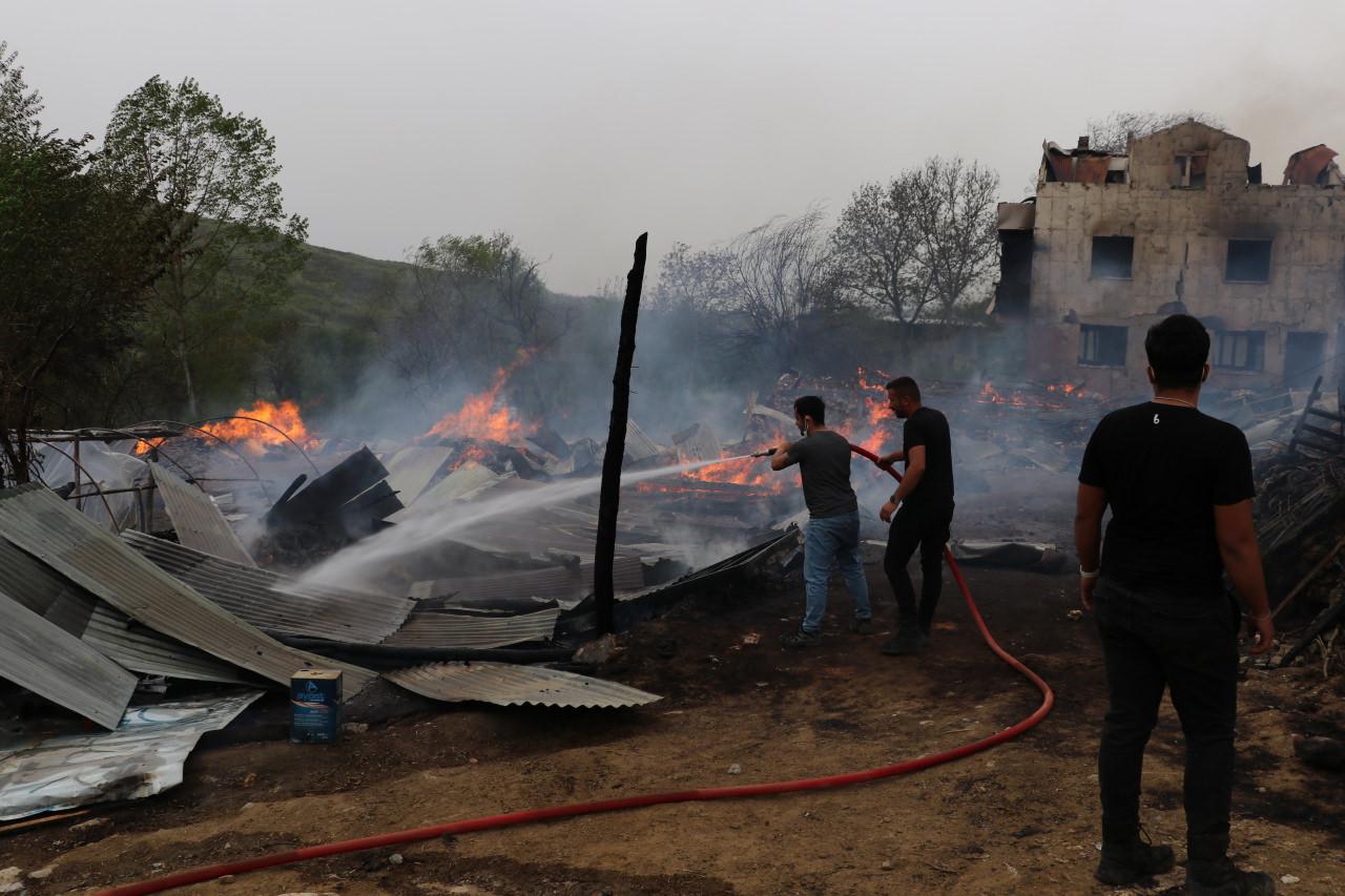 Ekiplerce güçlükle söndürülen yangında 2 ev, ambar, odunluk, samanlık, sera ve 2 ahır kullanılmaz hale geldi.