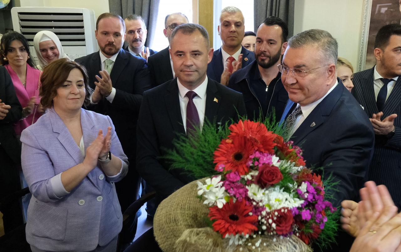 Makama gelen Kesimoğlu’na, Bulut tarafından çiçek verildi.
