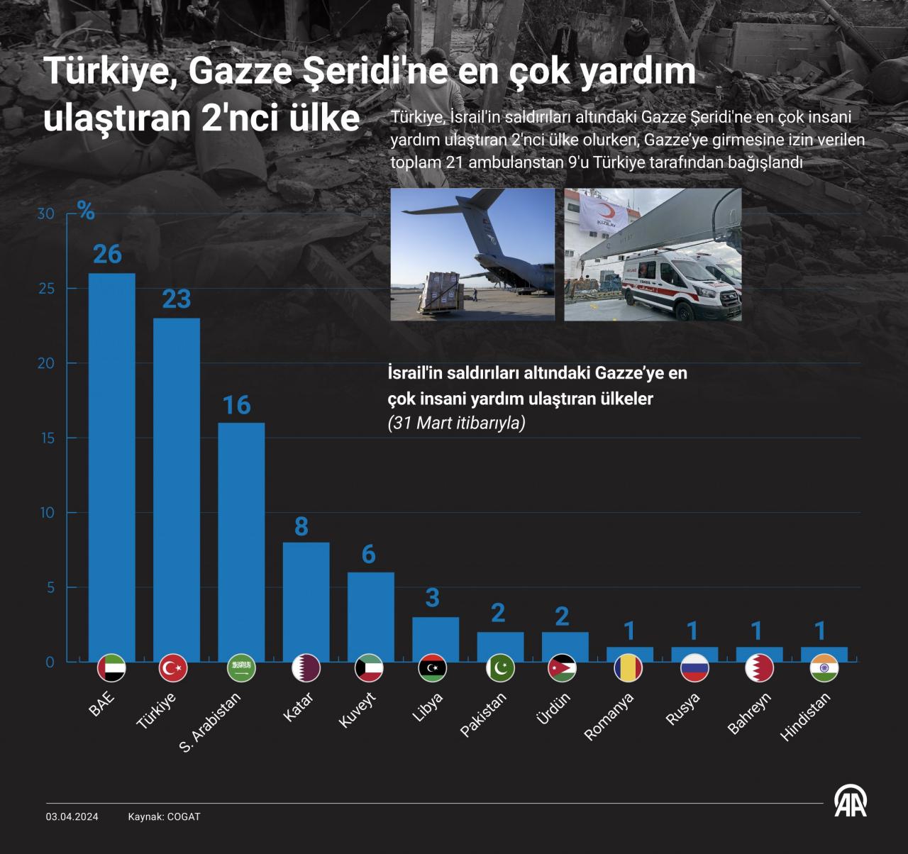 TÜRK Kızılay Genel Başkanı Fatma Meriç Yılmaz, Türkiye’nin 7 Ekim’de bu yana Gazze’ye 42 bin ton insani yardım gönderdiğini belirterek, “Şimdiye kadar 12 uçak ve 8 tane gemi gitmiş durumda. 9’uncu gemimizi de 15 Nisan’da ‘Kızılay İyilik Gemisi’ olarak gönderiyor olacağız. Bunların içinde ihtiyaca göre, Filistin Kızılay’ıyla görüşüyoruz ne ihtiyaç varsa onu gönderiyoruz” dedi.