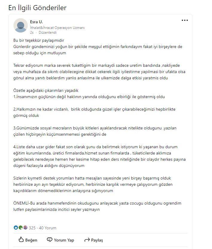Küflü çikolata paylaşımı ile gündeme gelen tüketici linkedin hesabı üzerinden teşekkür paylaşımı yaptı.