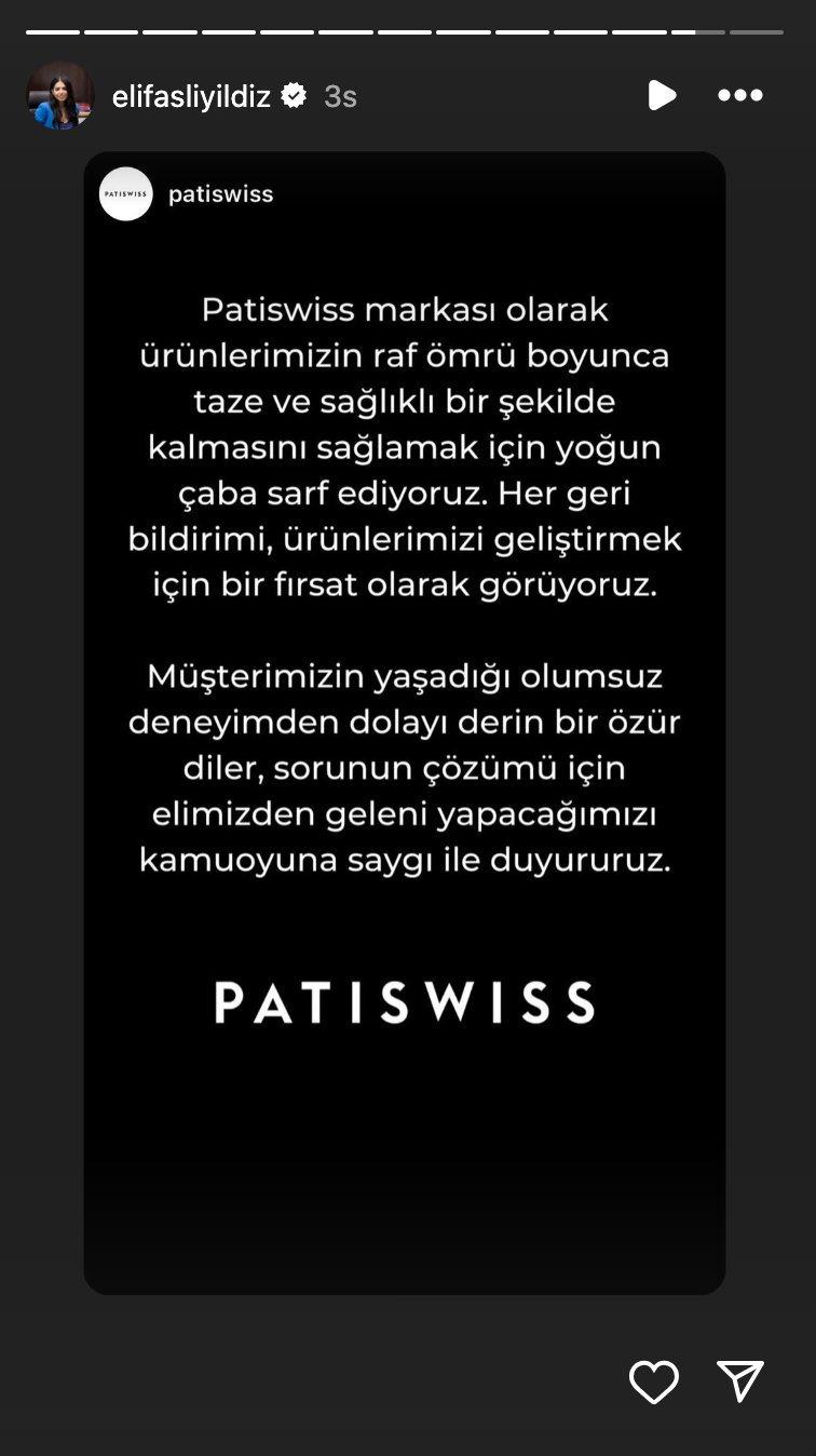 Daha sonra markadan yapılan açıklamada, “Patiswiss markası olarak ürünlerimizin raf ömrü boyunca taze ve sağlıklı bir şekilde kalmasını sağlamak için yoğun çaba sarf ediyoruz. Farklı etkenlerden kaynaklı oluşan ürün sıkıntılarında müşteri hizmetleri ve ilgili departmanlarımız ile tüm detayları inceleyerek çözüme ulaştırıyoruz. Her geri bildirimi, ürünlerimizi geliştirmek için bir fırsat olarak görüyoruz” ifadeleri kullanıldı.
