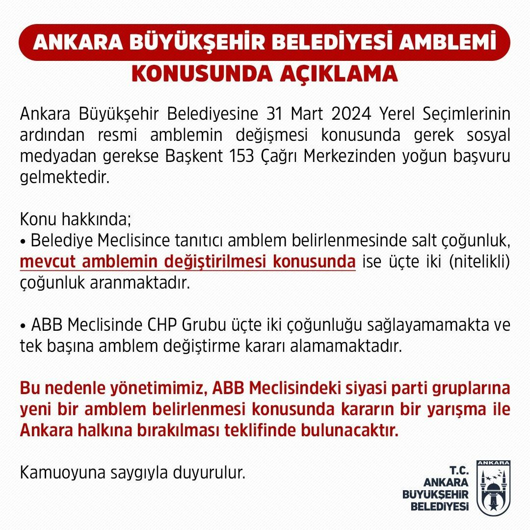 Ankara Büyükşehir Belediyesi’nden yapılan açıklamada, 31 Mart yerel seçimlerinin ardından resmi amblemin değişmesi konusunda yoğun başvuru geldiği öne sürülerek, konunun belediye meclisine taşınacağı kaydedildi. ABB Meclisinde amblem değişimi için CHP grubunun üçte iki oranındaki çoğunluğu sağlayamadığı ifade edilen açıklamada, diğer siyasi parti gruplarına yeni logo belirlenmesi yönünde bir yarışma teklifinde bulunulacağı ifade edildi