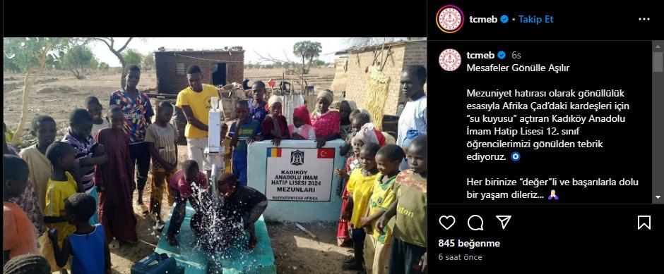 Mesafeler Gönülle AşılırMezuniyet hatırası olarak gönüllülük esasıyla Afrika Çad’daki kardeşleri için “su kuyusu” açtıran Kadıköy Anadolu İmam Hatip Lisesi 12. sınıf öğrencilerimizi gönülden tebrik ediyoruz.Her birinize “değer”li ve başarılarla dolu bir yaşam dileriz… pic.twitter.com/sl2sCmnurX
