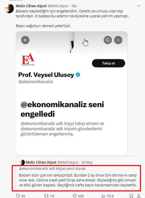 Melis Cihan Alput, Veysel Ulusoy’u dinleyerek yatırımını dövize yapan babasının üzüntüsünden beyin kanaması geçirdiğini duyurdu. Alput, ‘Babam sizin çok sıkı takipçinizdi. Bundan 2 ay önce tüm altınlarını satıp dolar aldı. Üstüne kredi çekti biraz daha ekledi. Söylediğiniz gibi olmadı ve kötü günler başladı. Geçtiğimiz hafta beyin kanamasından kaybettik. Babamı kaybettiğim için engellendim. Üstelik sorumlusu olan kişi tarafından. O sadece bu adamın tavsiyesine uyarak yatırım yapmıştı. Başın sağolsun demesi yeterliydi’ sözleriyle isyan etti.