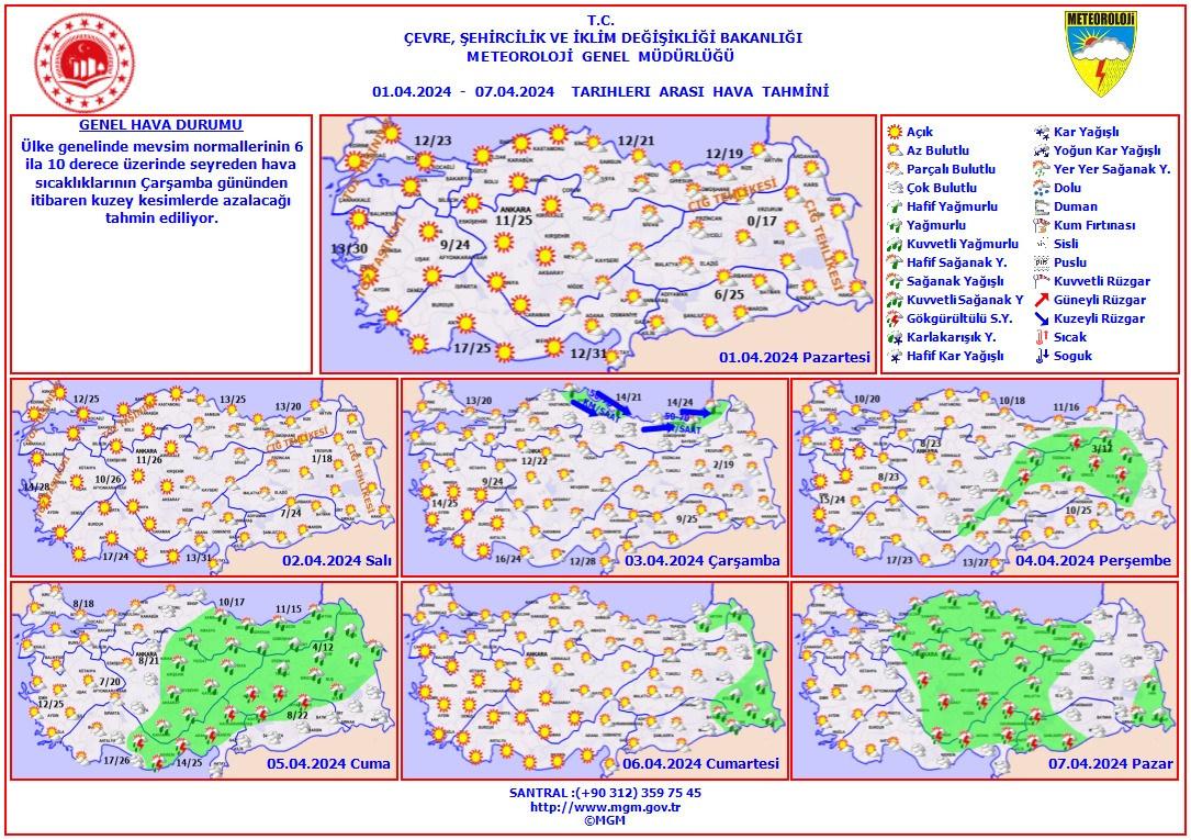 Rüzgarın genellikle güneyli, yurdun iç ve doğu kesimlerinde kuzeyli yönlerden hafif, ara sıra orta kuvvette esmesi bekleniyor.