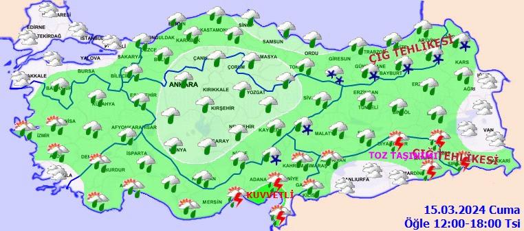 Doğu Karadeniz’in iç kesimleri, Doğu Anadolu’nun kuzey ve doğusu ile Orta Torosların yüksek kar örtüsüne sahip dik yamaçlarında çığ tehlikesi bulunmaktadır. Yurdun güneydoğu kesimlerinde toz taşınımı bekleniyor.