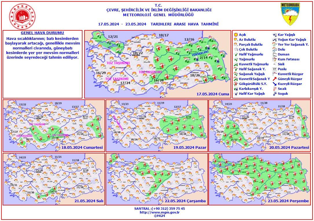 Meteoroloji Genel Müdürlüğü tarafından yapılan son değerlendirmelere göre, ülkemiz genelinin parçalı yer yer çok bulutlu, Doğu Akdeniz’in iç kesimleri, İç Anadolu’nun doğusu, Doğu Karadeniz’in iç kesimleri, Doğu Anadolu’nun kuzey ve doğusu ile İstanbul, Edirne, Kırklareli, Kocaeli, Sakarya ve Tokat çevrelerinin sağanak ve gök gürültülü sağanak yağışlı geçeceği tahmin ediliyor.