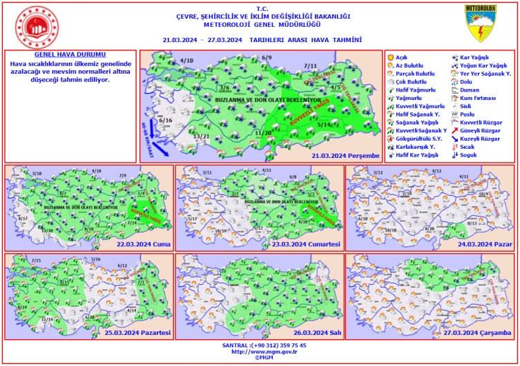 Meteoroloji Genel Müdürlüğü tarafından yapılan son tahminlere göre ülke genelinin parçalı ve çok bulutlu, (Çanakkale hariç) Marmara, Ege’nin kuzeydoğusu, Doğu Akdeniz ve Antalya’nın çevre ilçeleri, (Konya hariç) İç Anadolu, Karadeniz, Doğu ve Güneydoğu Anadolu’nun yağışlı geçeceği tahmin ediliyor.