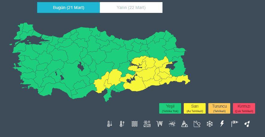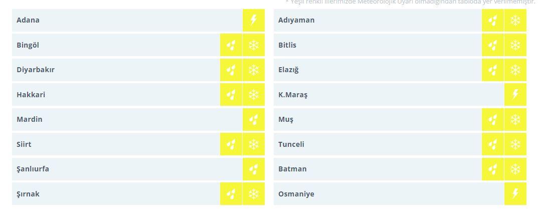 Sağanak beklenen Adana, Kahramanmaraş, Mardin, Osmaniye ile karla karışık yağmur ve kar beklenen, Adıyaman, Bingöl, Bitlis, Diyarbakır, Elazığ, Hakkari, Muş, Siirt, Tunceli, Batman ve Şırnak için “sarı” kodlu uyarıda bulunuldu.