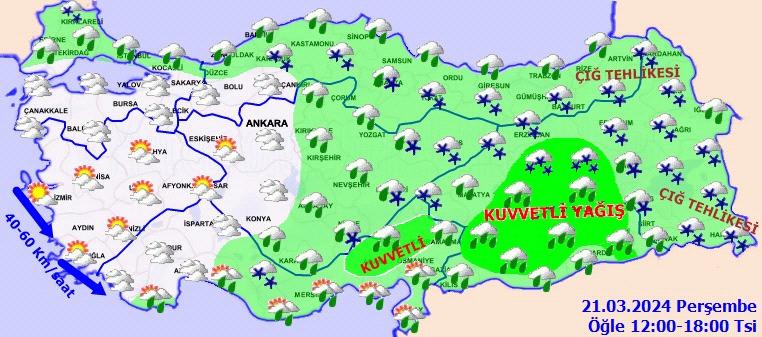 Genellikle yağmur ve sağanak, zamanla sıcaklıkların düşmesiyle 1200 metre üzeri rakımlı kesimli yerlerde kuvvetli karla karışık yağmur ve yer yer yoğun kar şeklinde olması beklenen yağışların, gece saatlerinde bölgenin batısında etkisini kaybetmesi, doğusunda ise yarın akşam saatlerine kadar etkili olması bekleniyor.