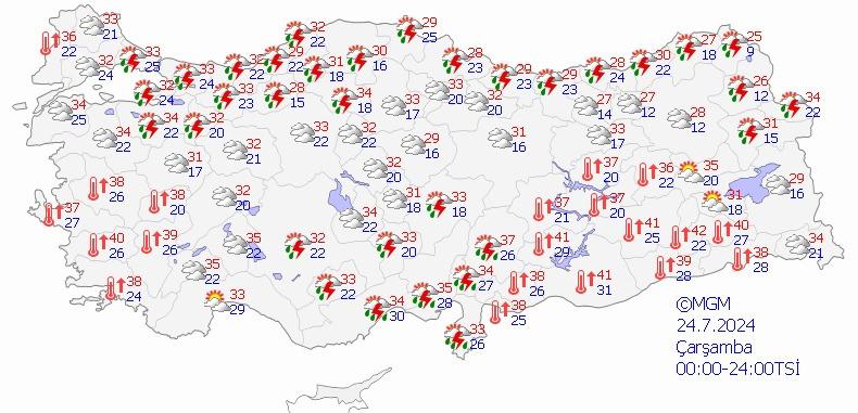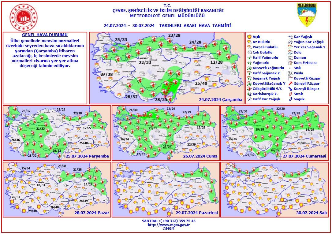 Meteoroloji Genel Müdürlüğü olarak yapılan değerlendirmelere göre: Ülkemiz genelinin parçalı, yer yer çok bulutlu, Marmara’nın doğusu, Orta Akdeniz’in iç kesimleri, Doğu Akdeniz, Batı Karadeniz, Orta ve Doğu Karadeniz kıyıları, İstanbul, Konya, Karaman, Niğde, Kayseri, Çankırı, Sivas, Artvin, Kars, Ardahan, Iğdır, Ağrı çevreleri ile Balıkesir’in kuzey, Erzurum ve Van’ın kuzey ve doğu kesimlerinin yerel olmak üzere sağanak ve gök gürültülü sağanak yağışlı geçeceği tahmin ediliyor. Yağışların Doğu Akdeniz’de yer yer kuvvetli olması bekleniyor.