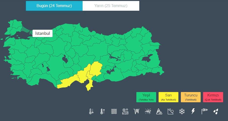 Parçalı ve az bulutlu, Orta Akdeniz’in iç kesimleri ile Doğu Akdeniz’in yerel olmak üzere sağanak ve gök gürültülü sağanak yağışlı geçeceği tahmin ediliyor. Yağışların, öğle saatlerinden sonra Mersin, Adana ve Osmaniye çevreleri ile Hatay’ın kıyı, Kahramanmaraş’ın güneybatı kesimlerinde yerel olarak kuvvetli olması bekleniyor.