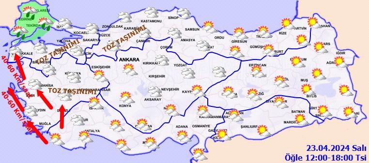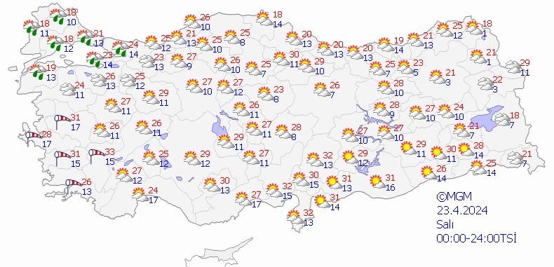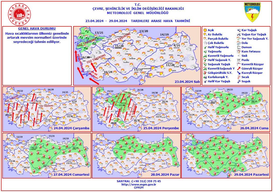 Meteoroloji Genel Müdürlüğü tarafından yapılan son değerlendirmelere göre; Yurdun kuzey ve batı kesimlerinin parçalı ve yer yer çok bulutlu, Trakya ile İstanbul, Kocaeli ve Çanakkale çevrelerinin sağanak ve yer yer gök gürültülü sağanak yağışlı, diğer yerlerin az bulutlu ve açık geçeceği tahmin ediliyor. Rüzgarın Güney ve Kıyı Ege’de kuvvetli olarak (40-60 km/saat) esmesi bekleniyor. İç ve batı bölgelerde toz taşınımı görüleceği tahmin ediliyor.