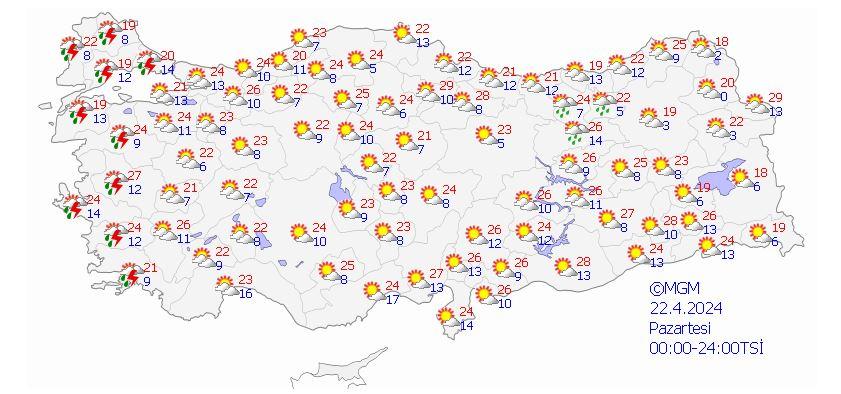 Meteoroloji Genel Müdürlüğü tarafından yapılan son değerlendirmelere göre; Ülkemizin kuzey ve batı kesimlerinin parçalı yer yer çok bulutlu, Marmara’nın batısı, Kıyı Ege, Ordu, Giresun, Trabzon ve Rize illerinin iç ve yüksek kesimleri, Manisa ve Antalya’nın kuzeybatısı ile gece saatlerinden itibaren Balıkesir, Bursa ve Yalova çevrelerinin yerel olmak üzere sağanak ve yer yer gök gürültülü sağanak yağışlı, diğer yerlerin parçalı ve az bulutlu geçeceği tahmin ediliyor. Marmara’nın batısı, Güney ve Kıyı Ege ile Batı Akdeniz’de toz taşınımı bekleniyor.