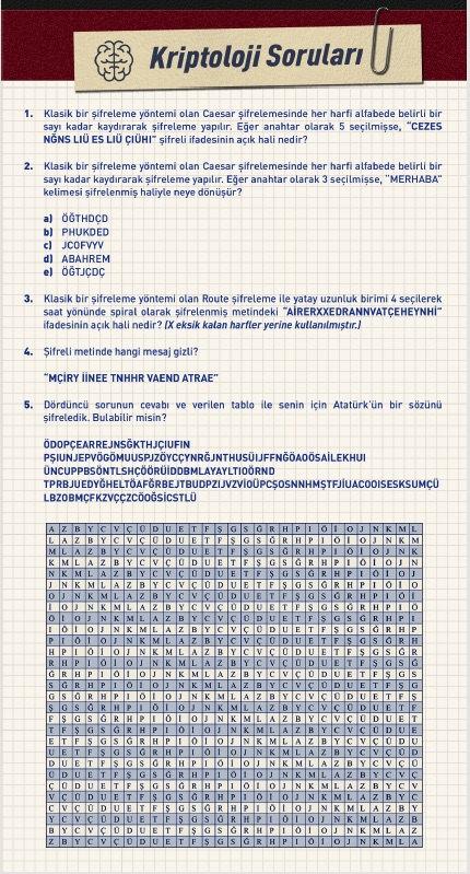İnternet sitesinde, klasik bir şifreleme yöntemi olan “Caesar” ve “Route” sistemleriyle hazırlanmış 5 soru yer alıyor.