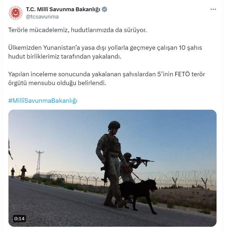 Bakanlığın sosyal medya hesabından yapılan açıklamada, “Terörle mücadelemiz, hudutlarımızda da sürüyor. Ülkemizden Yunanistan’a yasa dışı yollarla geçmeye çalışan 10 şahıs hudut birliklerimiz tarafından yakalandı. Yapılan inceleme sonucunda yakalanan şahıslardan 5’inin FETÖ terör örgütü mensubu olduğu belirlendi” denildi.