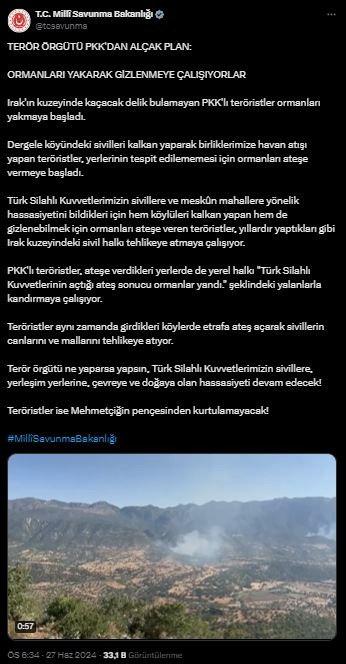 Bakanlığın “Terör örgüt PKK’dan alçak plan” başlıklı açıklamasında teröristlerin Irak’ın kuzeyinde yerlerinin tespit edilmesini önlemek için ormanları yaktığını ve bölgedeki halka da “Türk Silahlı Kuvvetlerinin açtığı ateş sonucu ormanlar yandı.” yalanını söyledikleri belirtildi.