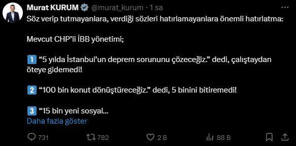Kurum, X sosyal medya hesabından yaptığı paylaşımda, CHP’li İBB yönetiminin söz verip de yerine getirmediği projelerin bir kısmını açıkladı. Gerçekleştirilemeyen vaatleri 10 maddede sıralayan Kurum, “İstanbul’a verdiği sözleri hatırlamayanları, 31 Mart’ta da İstanbullular hatırlamayacak. Nisanda geliyoruz.” değerlendirmesini yaptı.