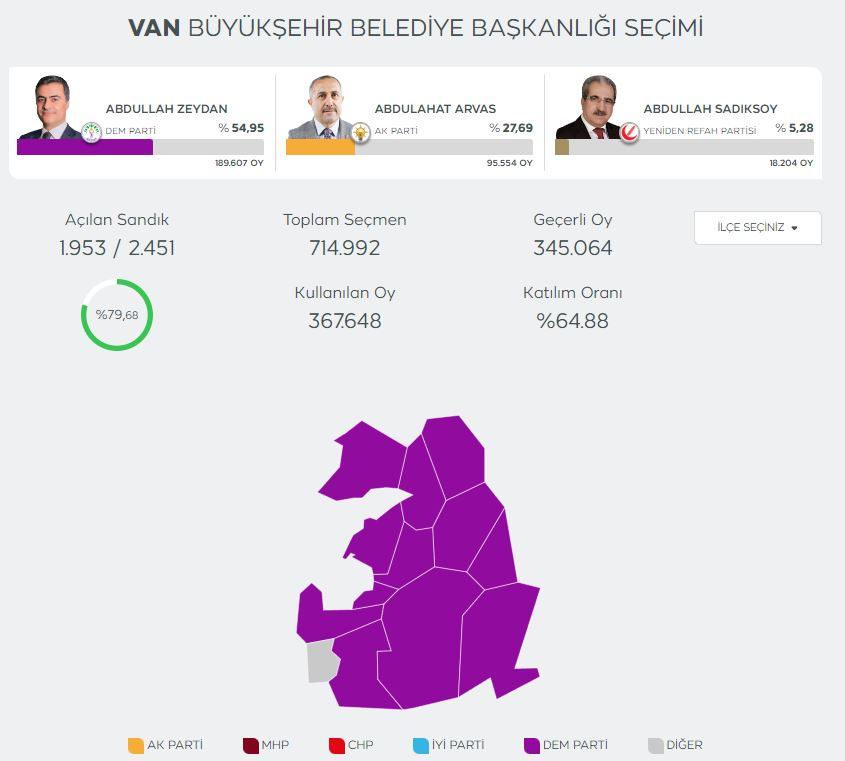 DEM Parti’nin Van Büyükşehir Belediye Başkan adaylarından olan Abdullah Zeydan resmi olmayan sonuçlara seçimi kazandı. Sandıkların yüzde 79,68'i açılan Van'da Abdullah Zeydan oyların yüzde 55'ini aldı.