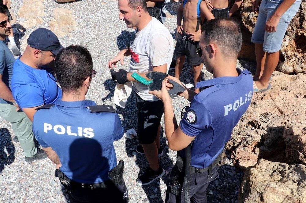 Polise direnmeyi sürdüren 5 kişi, takviye ekiplerin gelmesiyle biber gazıyla etkisiz hale getirilerek kelepçelendi. Polis, 5 kişinin üzerinden çalındığı iddia edilen cep telefonu çıkmayınca, olayın yaşandığı bölgede ve kayaların arasında bir süre arama yaptı ancak sonuç elde edemedi.Polis, şüphelilerin kullandığı baltaya el koyarken, neşteri ise aramaya rağmen bulamadı.BİBER GAZINDAN ETKİLENDİ, YÜZÜNÜ POLİS YIKADIDiğer yandan kelepçelenen şüphelilerden biri, biber gazından etkilendiğini ve nefes darlığı olduğunu söylemesi üzerine bir polis memuru tarafından sahildeki duş noktasına götürüldü.