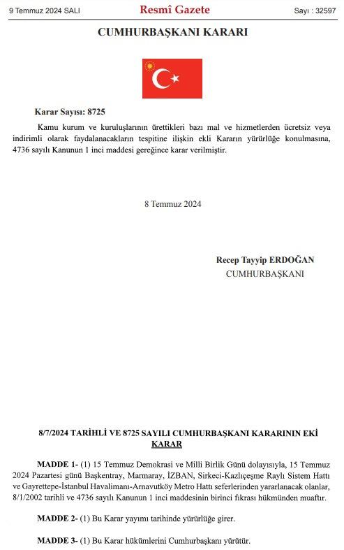 Resmi Gazete’de Cumhurbaşkanı Recep Tayyip Erdoğan’ın imzası ile yayımlanan karara göre, 15 Temmuz Demokrasi ve Milli Birlik Günü dolayısıyla Ankara’da Başkentray, İstanbul’da Marmaray, Sirkeci-Kazlıçeşme Raylı Sistem Hattı, Gayrettepe-İstanbul Havalimanı-Arnavutköy-Metro hattı ve İzmir’de İZBAN ücretsiz olacak.