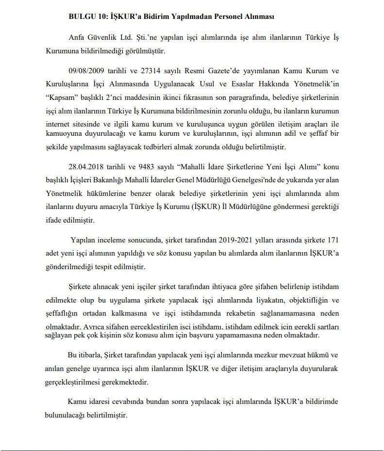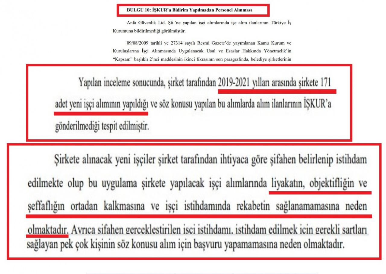 Sayıştay Başkanlığı’nın denetim raporunda belirtildiği üzere; “Anfa Güvenlik Ltd. Şti.’ne yapılan işçi alımlarında işe alım ilanlarının Türkiye İş Kurumuna bildirilmediği görülmüştür. 09/08/2009 tarihli ve 27314 sayılı Resmi Gazete’de yayımlanan Kamu Kurum ve Kuruluşlarına İşçi Alınmasında Uygulanacak Usul ve Esaslar Hakkında Yönetmelik’in “Kapsam” başlıklı 2’nci maddesinin ikinci fıkrasının son paragrafında, belediye şirketlerinin işçi alım ilanlarının Türkiye İş Kurumuna bildirilmesinin zorunlu olduğu, bu ilanların kurumun internet sitesinde ve ilgili kamu kurum ve kuruluşunca uygun görülen iletişim araçları ile T.C. Sayıştay Başkanlığı Ankara Büyükşehir Belediyesi Anfa Güvenlik Hizmetleri ve Sistemleri Limited Şirketi 2021 Yılı Sayıştay Düzenlilik Denetim Raporunda kamu kurum ve kuruluşlarının, işçi alımının adil ve şeffaf bir şekilde yapılmasını sağlayacak tedbirleri almak zorunda olduğu belirtilmiştir.