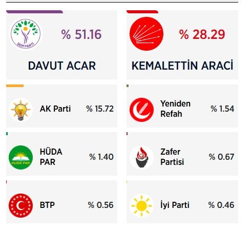 Saray seçimlerinde DEM Parti adayı Davut Acar 3 bin 807 oyla %51.15, CHP adayı Kemalettin Araci 2 bin 105 oyla %28.28 oranına ulaşmıştı.