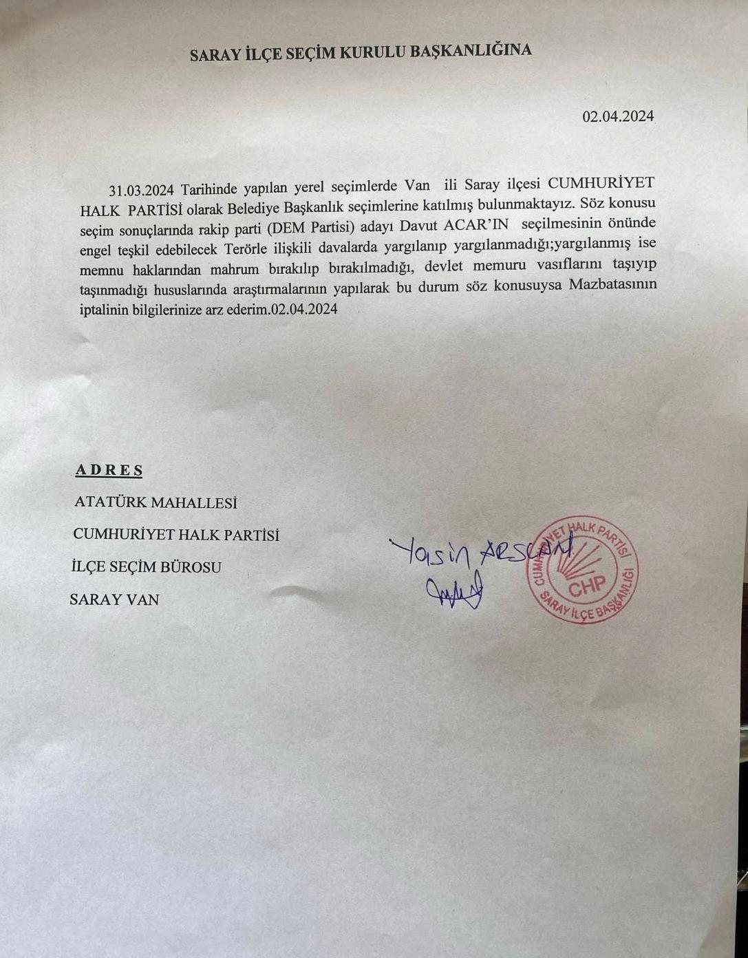 CHP Saray İlçe Başkan Yardımcısı Yasin Arslan tarafından Saray İlçe Seçim Kurulu Başkanlığına yapılan başvuruda, “DEM Partisi adayı Davut Acar’ın seçilmesinin önünde engel teşkil edebilecek terörle ilişkili davalarda yargılanıp yargılanmadığı; yargılanmış ise memnu haklarından mahrum bırakılıp bırakılmadığı, devlet memuru vasıflarını taşıyıp taşınmadığı hususlarında araştırmalarının yapılarak bu durum söz konusuysa Mazbatasının iptalinin bilgilerinize arz ederim” ifadelerine yer verildiği belirlendi.