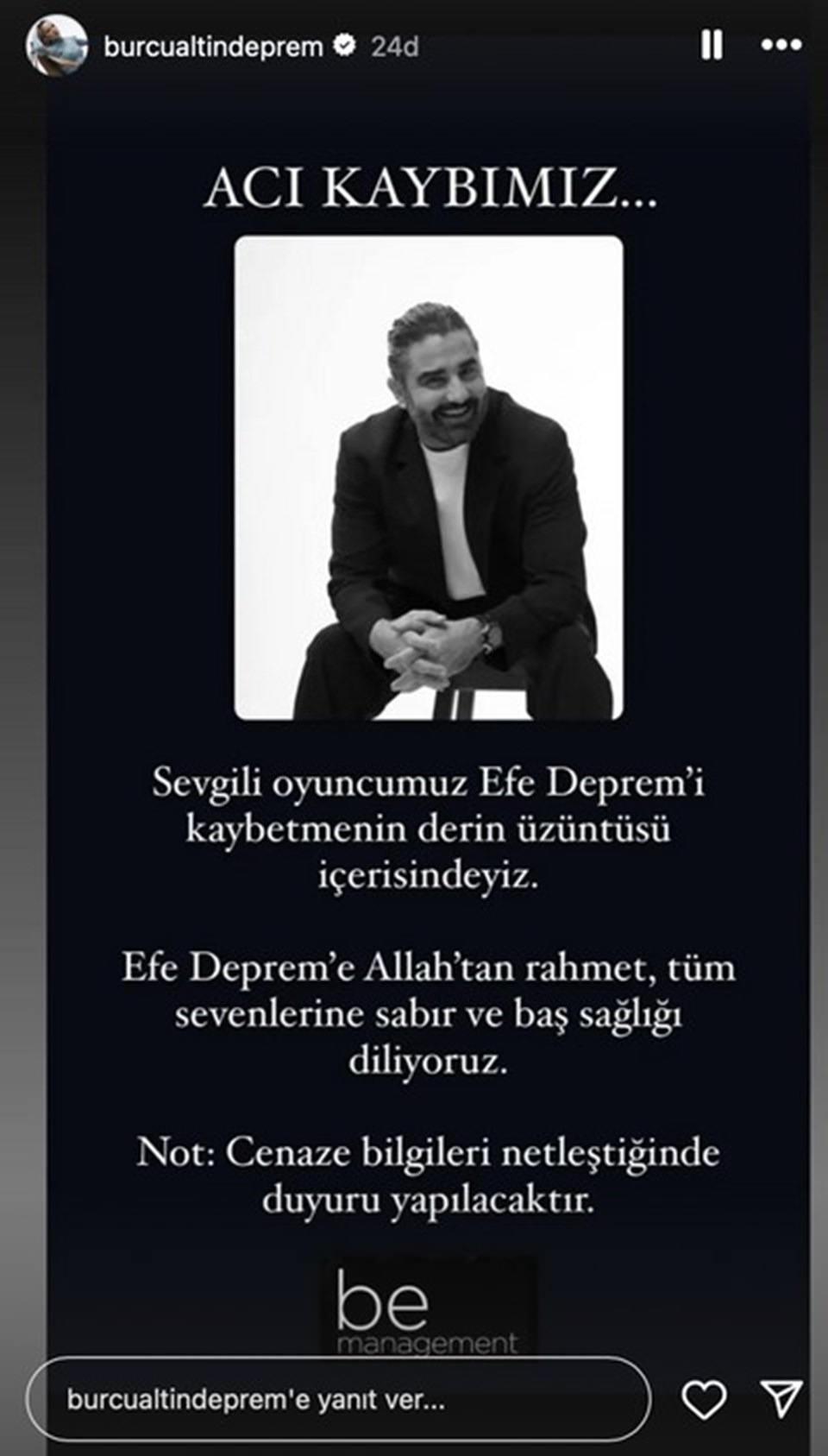 Oyuncunun eşi Burcu Altın Deprem sosyal medya hesabında acı haberi duyurdu.
