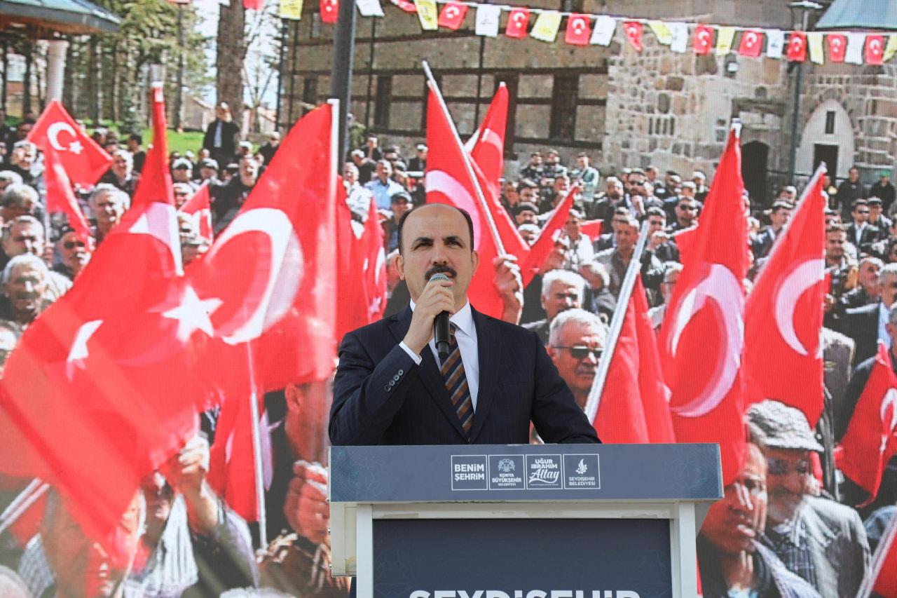 Başkan Altay programa katılan önceki dönem Sanayi ve Teknoloji Bakanı Mustafa Varank’a da teşekkür ederek, “Geçtiğimiz dönemde Konya’mız iki bakanla kabinede temsil ediliyordu. Şimdi 4 bakanla temsil ediliyor. Onun için meydanlarda söylediğimiz şey şu; Abdulmuttalip Demirel bir şey söylüyorsa arkasında Büyükşehir Belediyesi’nin gücü var, arkasında 4 bakanımızın gücü var, arkasında 11 milletvekilimizin gücü var. Arkasında Recep Tayyip Erdoğan’ın gücü var. Sefer bizden zafer Allah’tandır” sözleriyle konuşmasını tamamladı.