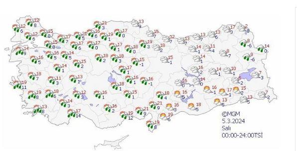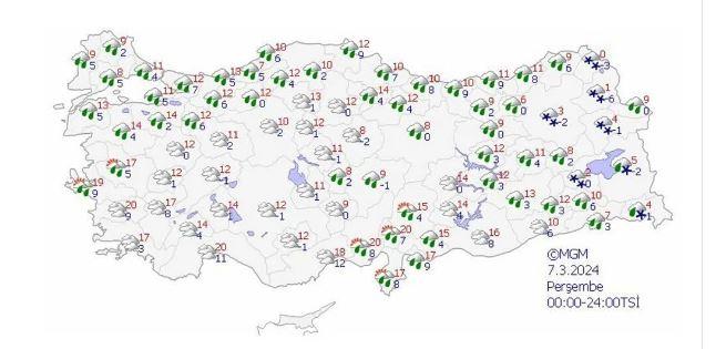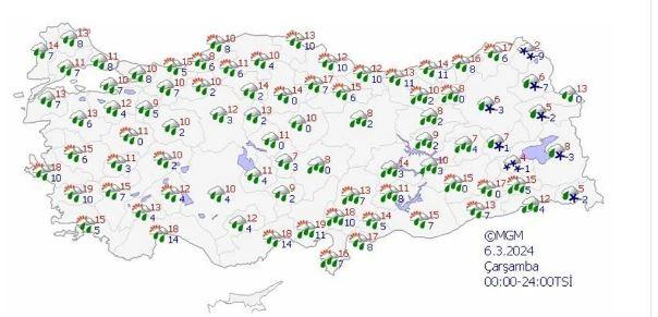 16 kent için de sarı ve turuncu kodlu uyarı verildi. Yağışların kıyı Ege, Batı Akdeniz kıyıları ile Adana ve Mersin çevrelerinde yer yer kuvvetli olması beklendiğinden yaşanabilecek olumsuzluklara karşı vatandaşların dikkatli ve tedbirli olunması istendi.