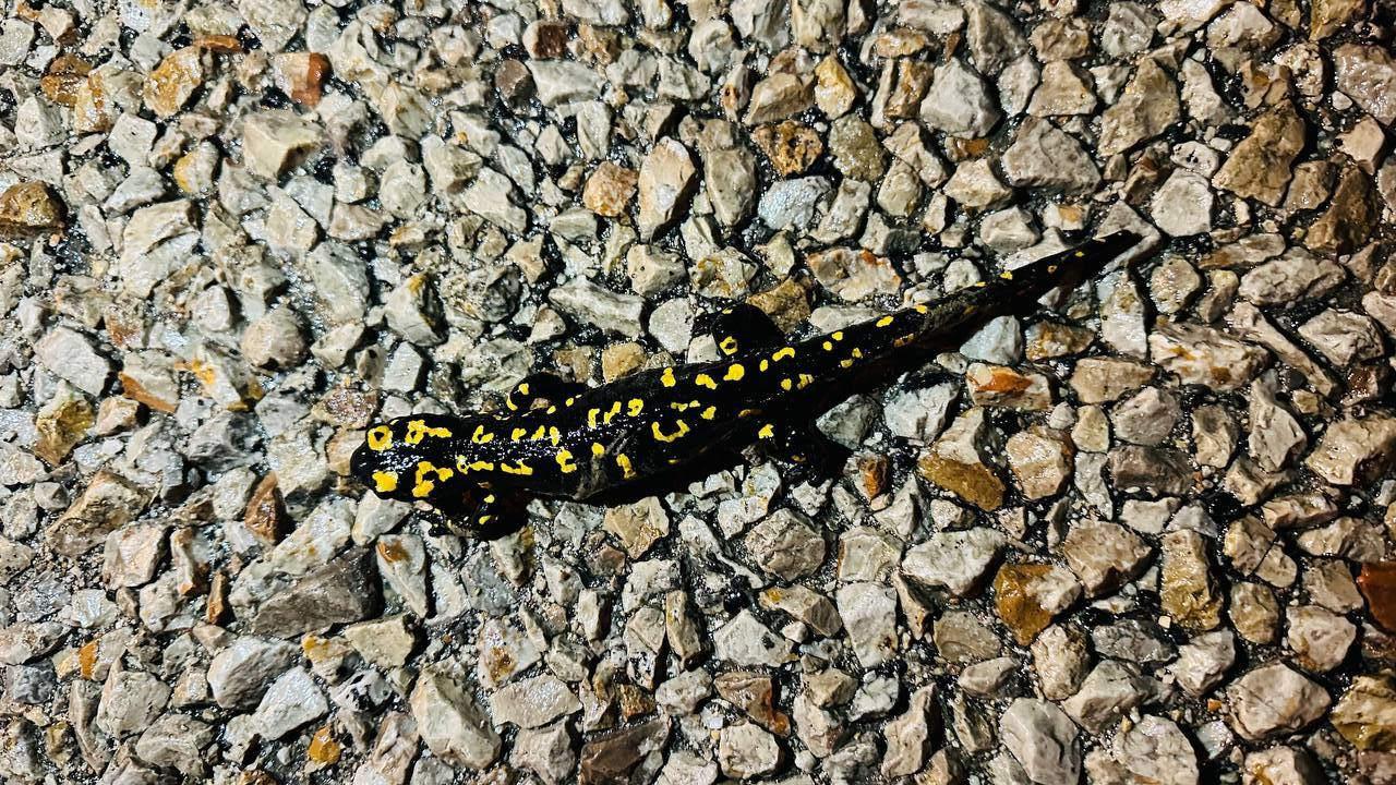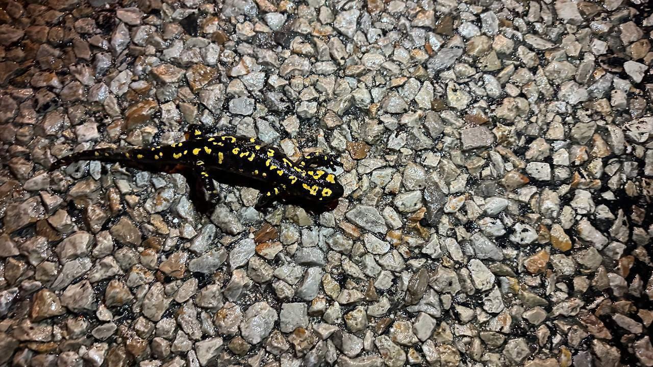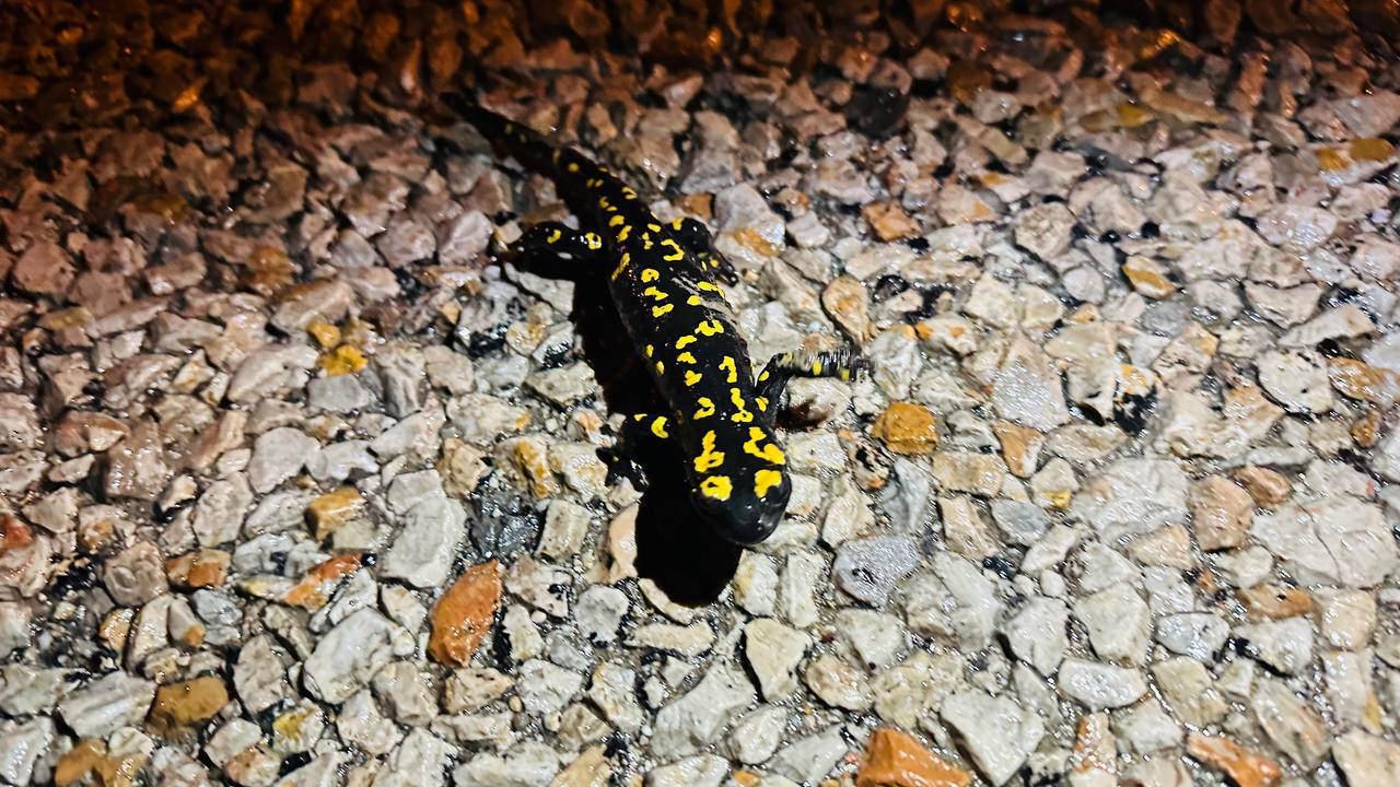 Yağışın etkili olduğu beldede Yıldız Mahallesi Cumhuriyet Caddesi’nde yol kenarında, korumada öncelikli ve azalan varlık durumuna sahip türlerden olan sarı benekli semender görüntülendi.