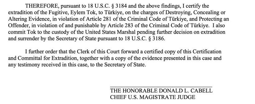 Taslak karar metninde hakimin Türkiye’den gelen delilleri yeterli bulduğu belirtilerek, “Kaçak olan Eylem Tok’un Türk Ceza Kanunu’nun 281’inci maddesine aykırı olarak delilleri yok etmek, saklamak ve değiştirmek; ayrıca Türk Ceza Kanunu’nun 283. maddesine aykırı olarak suçluyu korumaktan Türkiye’ye iadesini onaylıyorum. ABD Dışişleri Bakanı tarafından iade ve teslim konusunda daha ayrıntılı karar verilinceye kadar kendisini bu süre içinde gözetim altında tutulması için adli kolluk güçlerine teslim ediyorum” ifadesi yer aldı.