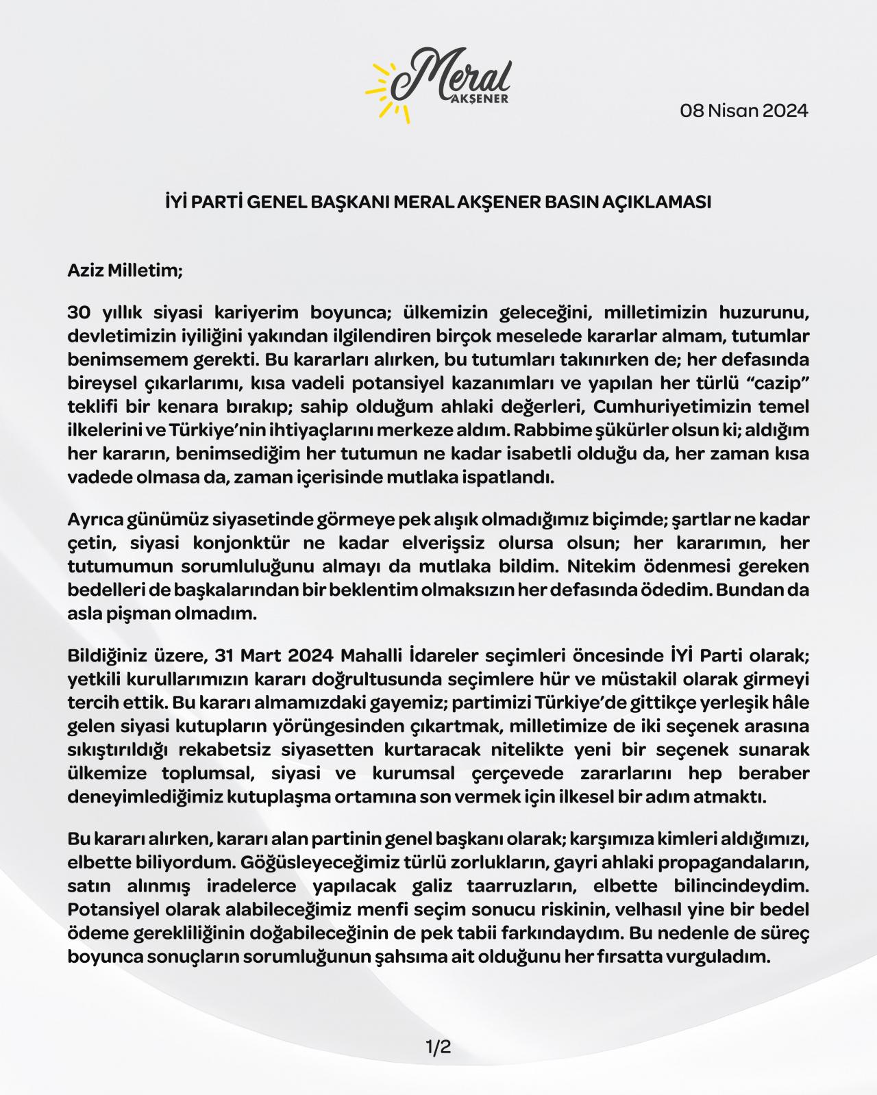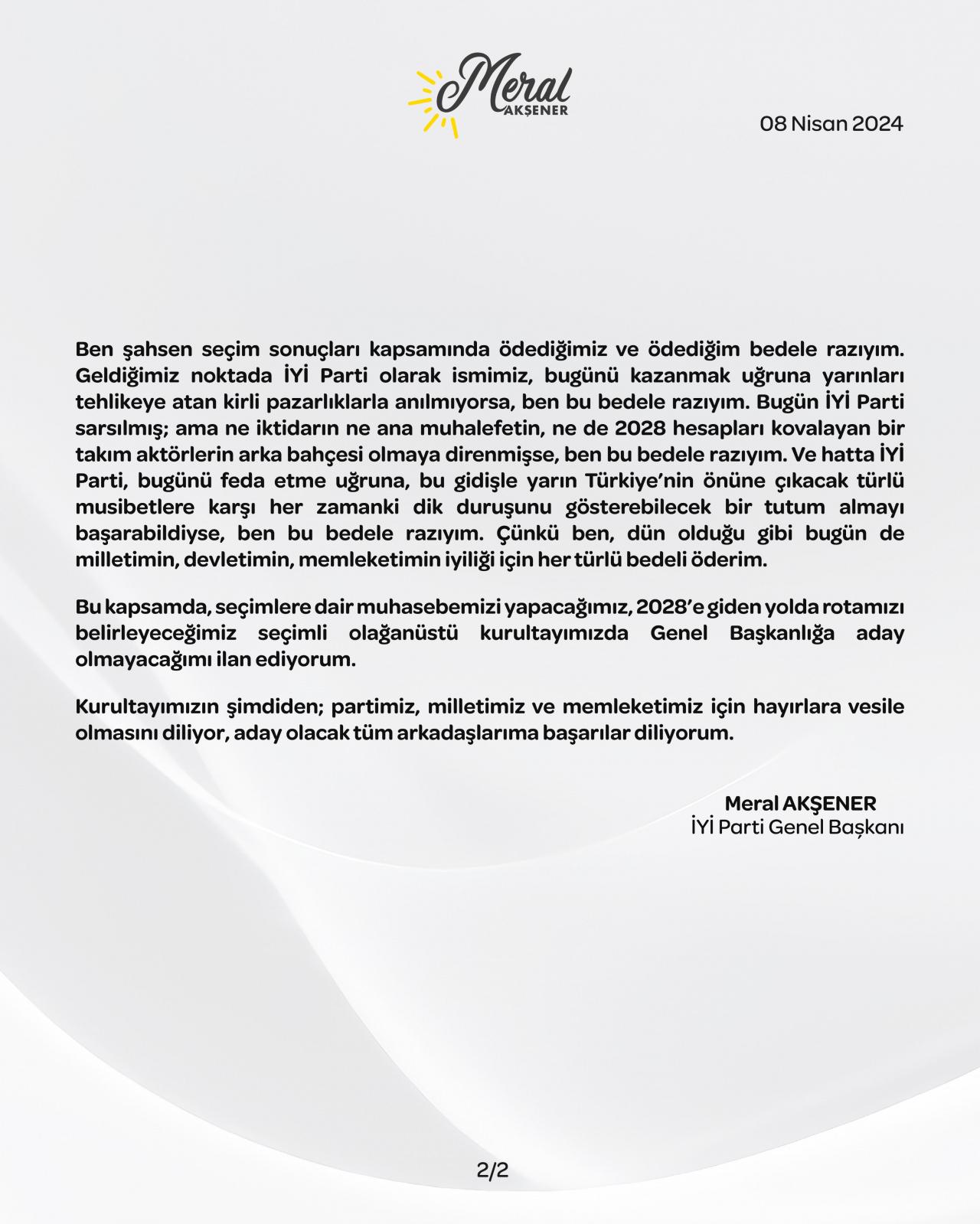 Ben şahsen seçim sonuçları kapsamında ödediğimiz ve ödediğim bedele razıyım. Geldiğimiz noktada İYİ Parti olarak ismimiz, bugünü kazanmak uğruna yarınları tehlikeye atan kirli pazarlıklarla anılmıyorsa, ben bu bedele razıyım.