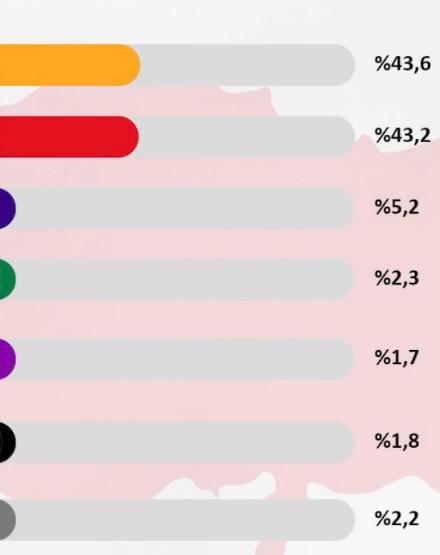 KAZANAN MURAT KURUMAnket sonuçlarına göre Murat Kurum İstanbul’da seçimleri kazanan isim oluyor. Birinci sıradaki aday yüzde 43,6, ikinci sıradaki aday ise yüzde 43, 2 oy oranına sahip.Seçim yasakları kapsamında aday ve parti isimleri kapatılmıştır.