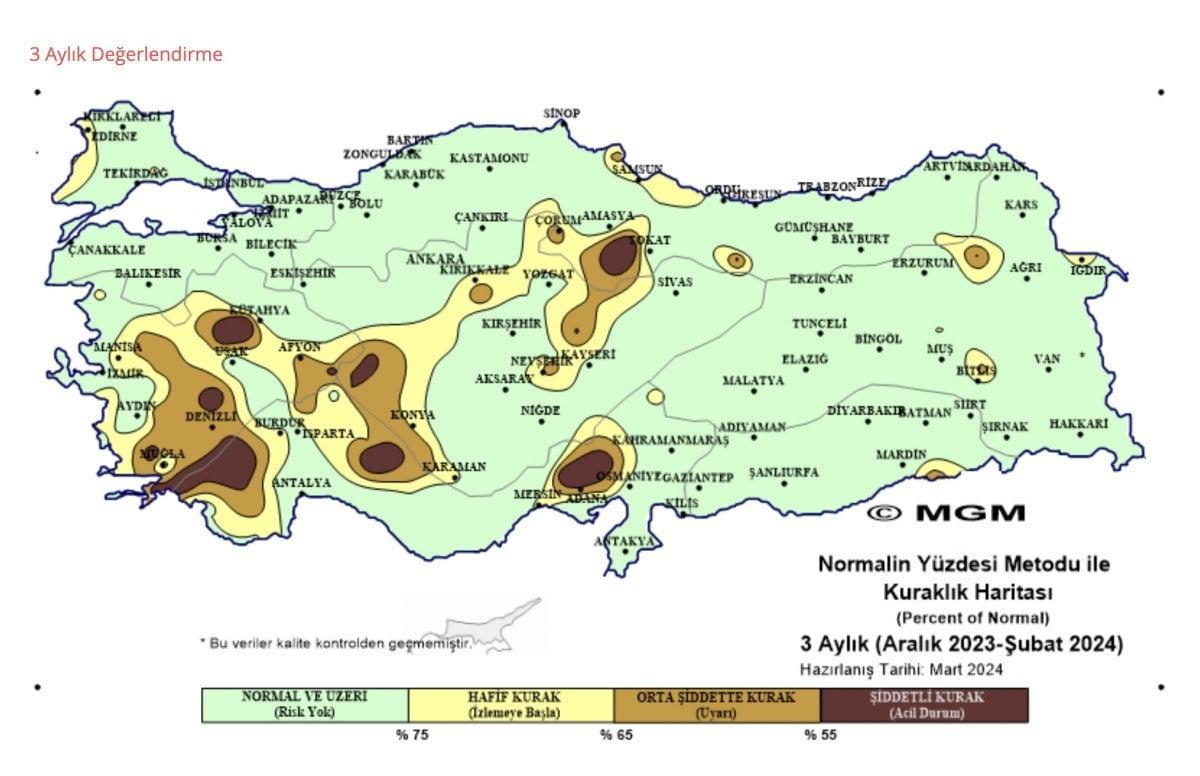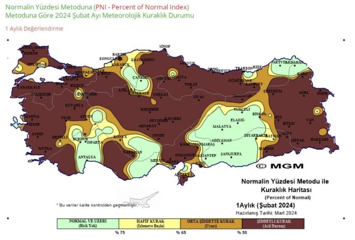 Çevre, Şehircilik ve İklim Değişikliği Bakanlığı’na bağlı Meteoroloji Genel Müdürlüğü’nün (MGM) normalin yüzdesi metoduna göre oluşturduğu, 2024 Şubat ayı meteorolojik kuraklık durumu haritası da Türkiye’deki kuraklık boyutunu gözler önüne serdi.