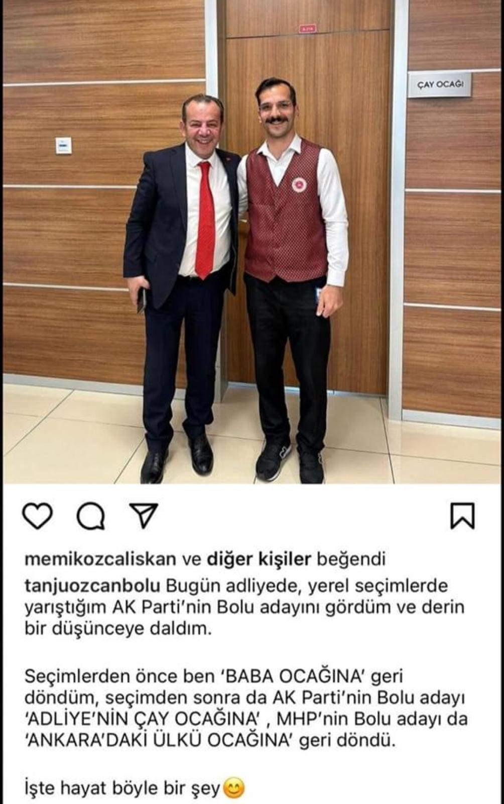 CHP’li Bolu Belediye Başkanı Tanju Özcan, Bolu Adliyesi’ne giderek çay ocağı görevlisiyle fotoğraf çektirdi. Tanju Özcan, bu fotoğrafı sosyal medya hesabından büyük bir yalanla paylaştı. Çay ocağı görevlisinin AK Parti’nin Bolu Büyükşehir Belediye Başkan adayı Muhammed Emin Demirkol olduğunu iddia eden CHP’li Özcan, “Bugün adliyede yerel seçimlerde yarıştığım AK Parti’nin Bolu adayını gördüm ve derin düşünceye daldım. Seçimlerden önce ben ‘baba ocağına’ geri döndüm, seçimden sonra da AK Parti’nin Bolu adayı Adliye’nin çay ocağına, MHP’nin Bolu adayı da Ankara’daki Ülkü Ocağına geri döndü. İşte hayat böyle bir şey” ifadelerini kullandı.