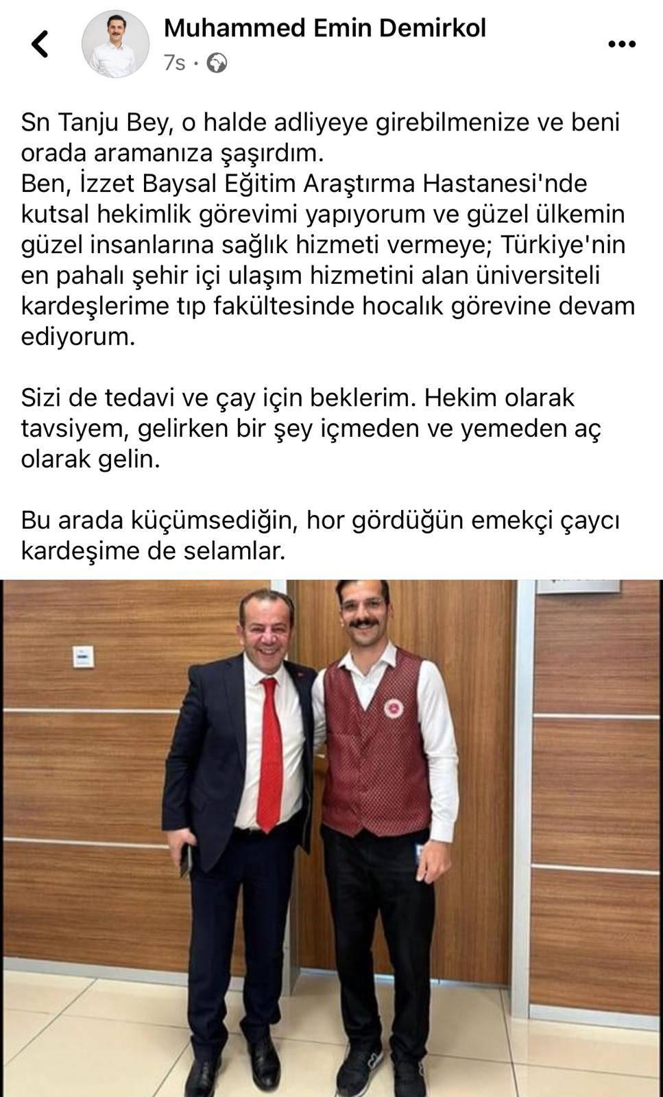 Tanju Özcan’ın kibir yüklü paylaşımına AK Partili Muhammed Emin Demirkol’dan cevap gecikmedi. Çay ocağı görevlisi değil hekim ve akademisyen olduğunu belirten Demirkol, Tanju Özcan’a yönelik şu sözleri sarf etti: