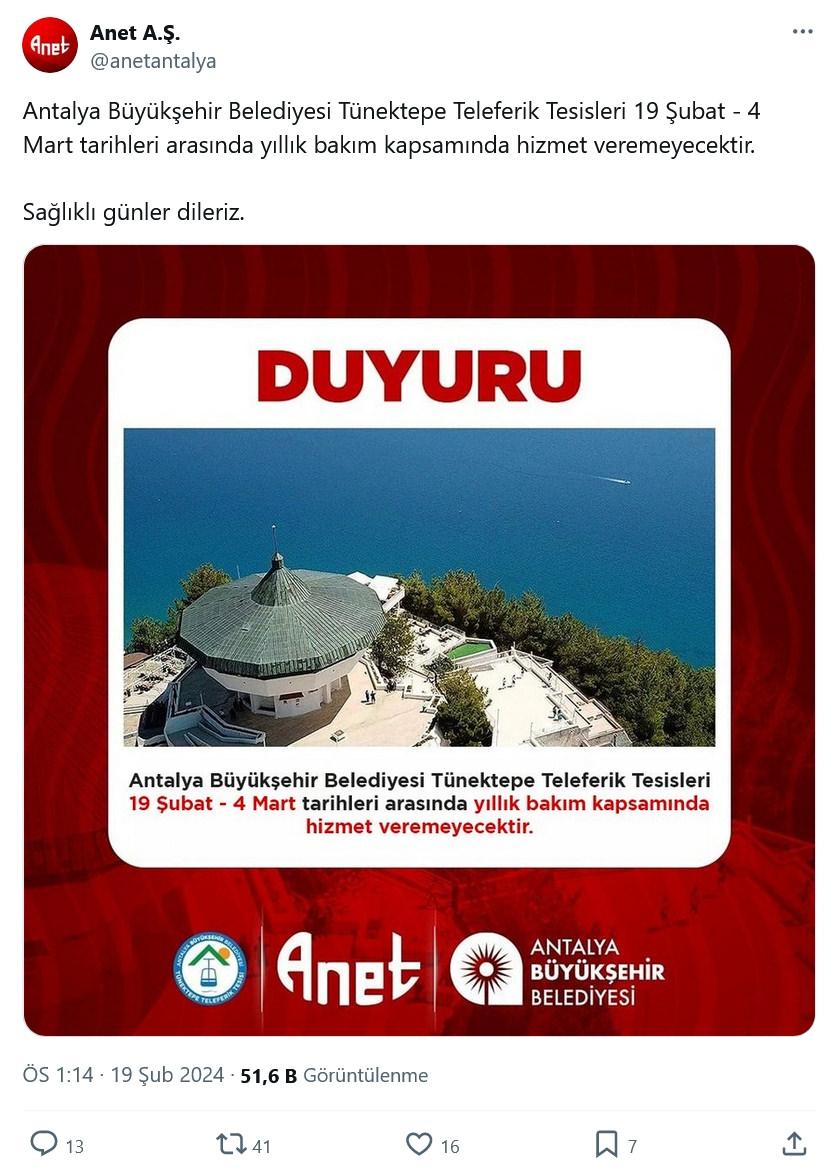 Antalya Büyükşehir Belediyesi’nin (ABB) işlettiği teleferikle ilgili olayın ilk anında yapılan “bakım ve onarımlarının yapıldığı” açıklamasının algı oluşturmaktan ibaret olduğu belirlendi. CHP’li ABB Başkanı Muhittin Böcek, teleferikle ilgili yıllık ağır ve rutin bakımlarının tamamının yapıldığını öne sürmüştü. Böcek, ”Yılbaşından sonra ağır bakımı protokolü, anlaşması zaten yapılmış. Sezon açılışı 5 Mart’ta başlamıştı. Diğer konularda gerekli çalışmaları yapacağız” demişti.