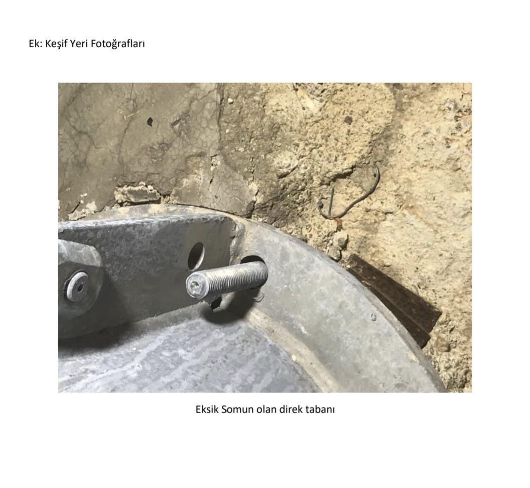5 nolu direğin toplam 7 flanştan ve toplam 10 parça boru direkten oluştuğu, alttan üçayakla yükseldiği, üstteki yedinci flanşta üçayağın birleşerek tek sütun olarak devam ettiği tespit edilen raporda, flanş bağlantılarını oluşturan cıvataların yerlere saçıldığı ve deforme olduklarının tespit edildiği, cıvatalardaki deformasyonun çekme-kesmeye bağlı olduğunun anlaşıldığına işaret edildi.