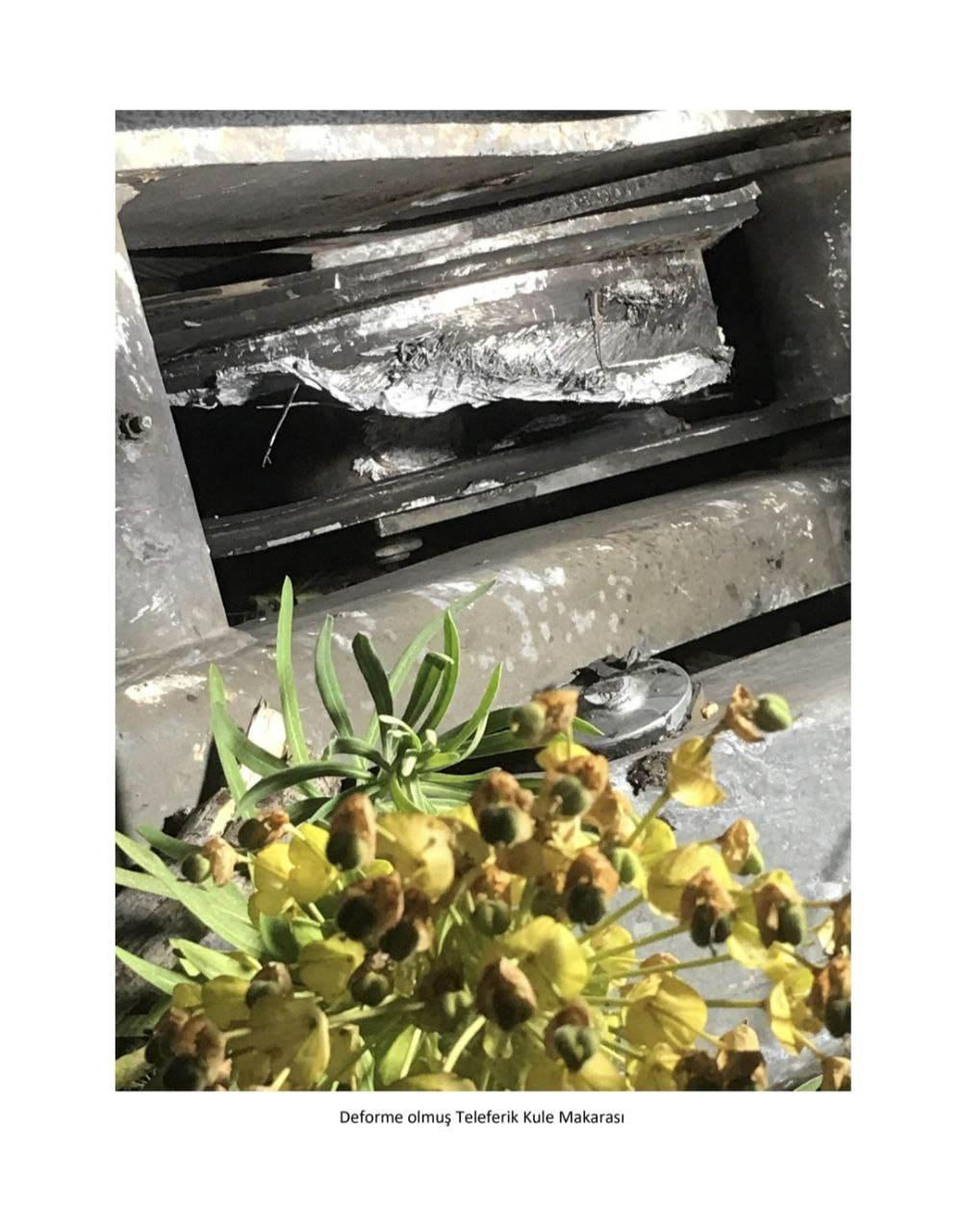“Tesisin işletmeye alındığı tarihten bugüne kadar 7 yıl sürenin geçmiş olduğu anlaşılmıştır. 12 Nisan saat 17.20 sularında 5 nolu teleferik direğinin flanş bağlantılarını sağlayan cıvataların koptuğu, sebebinin ise direk üzerindeki kabin taşıyıcı halat sisteminin üzerinden geçtiği makaralardaki nedeni anlaşılamayan deformasyonlardan dolayı makaranın metal aksamına sıkışması sonucu sistemin hareket yükünden dolayı meydana gelen kuvvetli çekme yüküne dayanamayıp direk üzerindeki flanşların bağlı olduğu cıvataların koptuğu tespit edilmiştir. Kopma sonucu direğin üst bölümünün çekme kuvveti sonucu kabinin alt kısmına çarparak çelik konstrüksiyonu koparttığı dolayısıyla kabin içerisindeki insanların aşağıya düştüğü keşif esnasındaki incelemelerimizden anlaşılmıştır.”