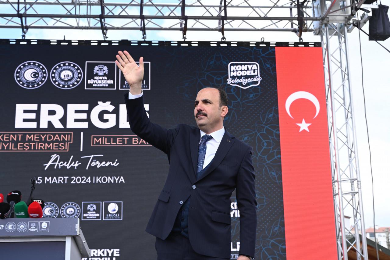 Konya Büyükşehir Belediyesi’nin Ereğli Tarihi Kent Meydanı Cephe İyileştirme Projesi’nin yanında birçok hizmeti kazandırdığını anımsatan Bakan Bolat, “Hizmetlerin devam etmesi için merkezde de yerelde de güçlü olmamız gerekiyor. İstikrarı kaybetmememiz gerekiyor. Merkezi hükümet emrinizde. Bakın Cumhurbaşkanımız 4 tane Konyalı bakana görev verdi. Ereğli’den de Allah’a şükür bize nasip oldu; Türkiye’mize, Konya’mıza, sizlere hizmet etmek” dedi.
