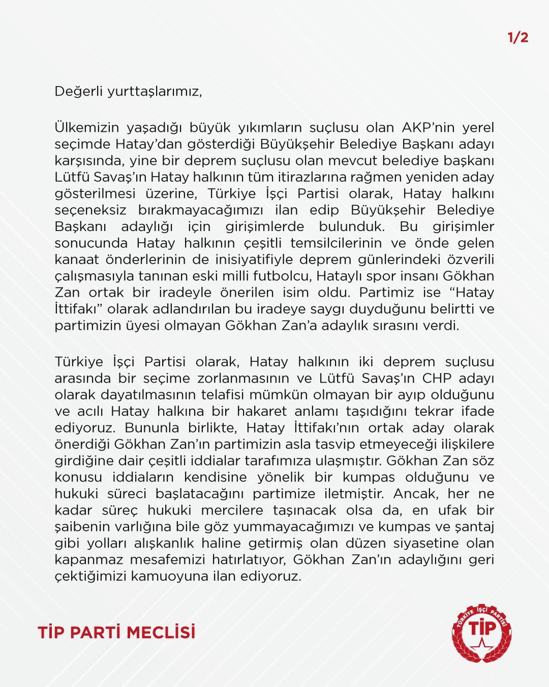 Ülkemizin yaşadığı büyük yıkımların suçlusu olan AKP’nin yerel seçimde Hatay’dan gösterdiği Büyükşehir Belediye Başkanı adayı karşısında, yine bir deprem suçlusu olan mevcut belediye başkanı Lütfü Savaş’ın Hatay halkının tüm itirazlarına rağmen yeniden aday gösterilmesi üzerine, Türkiye İşçi Partisi olarak, Hatay halkını seçeneksiz bırakmayacağımızı ilan edip Büyükşehir Belediye Başkanı adaylığı için girişimlerde bulunduk. Bu girişimler sonucunda Hatay halkının çeşitli temsilcilerinin ve önde gelen kanaat önderlerinin de inisiyatifiyle deprem günlerindeki özverili çalışmasıyla tanınan eski milli futbolcu, Hataylı spor insanı Gökhan Zan ortak bir iradeyle önerilen isim oldu. Partimiz ise “Hatay İttifakı” olarak adlandırılan bu iradeye saygı duyduğunu belirtti ve partimizin üyesi olmayan Gökhan Zan’a adaylık sırasını verdi.