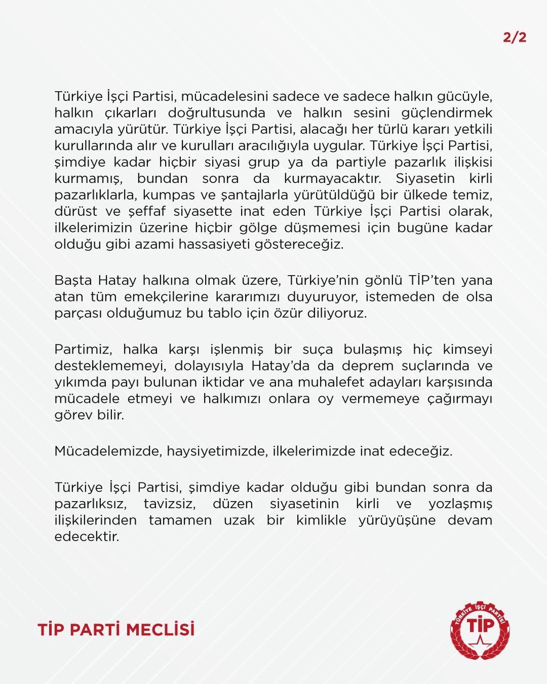 Başta Hatay halkına olmak üzere, Türkiye’nin gönlü TİP’ten yana atan tüm emekçilerine kararımızı duyuruyor, istemeden de olsa parçası olduğumuz bu tablo için özür diliyoruz.