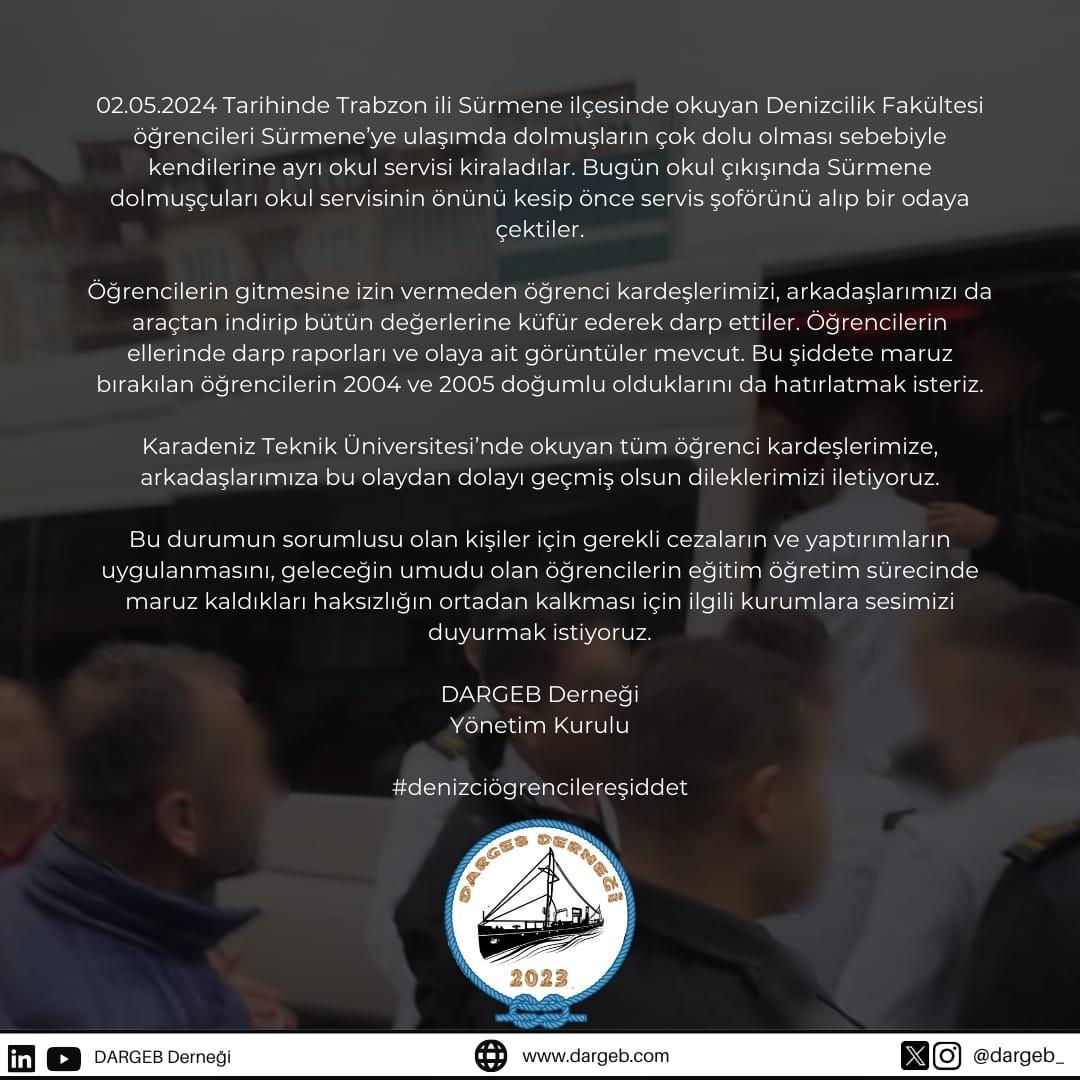 Paylaşımda, “Deniz Ulaştırma İşletme Mühendisliği öğrencileri kendilerine servis kiraladı. Durumu öğrenen Sürmene dolmuşçuları bir araya gelip, özel minibüsün önünü kesti. İddiaya göre bazı öğrenciler darbedildi. Öğrencilerin gitmesine izin vermeden öğrenci kardeşlerimizi, arkadaşlarımızı da araçtan indirip bütün değerlerine küfür ederek darbettiler. Öğrencilerin ellerinde darp raporları ve olaya ait görüntüler mevcut. Bu şiddete maruz bırakılan öğrencilerin 2004 ve 2005 doğumlu olduklarını da hatırlatmak isteriz. Karadeniz Teknik Üniversitesi’nde okuyan tüm öğrenci kardeşlerimize, arkadaşlarımıza bu olaydan dolayı geçmiş olsun dileklerimizi iletiyoruz. Bu durumun sorumlusu olan kişiler için gerekli cezaların ve yaptırımların uygulanmasını, geleceğin umudu olan öğrencilerin eğitim öğretim sürecinde maruz kaldıkları haksızlığın ortadan kalkması için ilgili kurumlara sesimizi duyurmak istiyoruz.” ifadeleri kullandıldı.