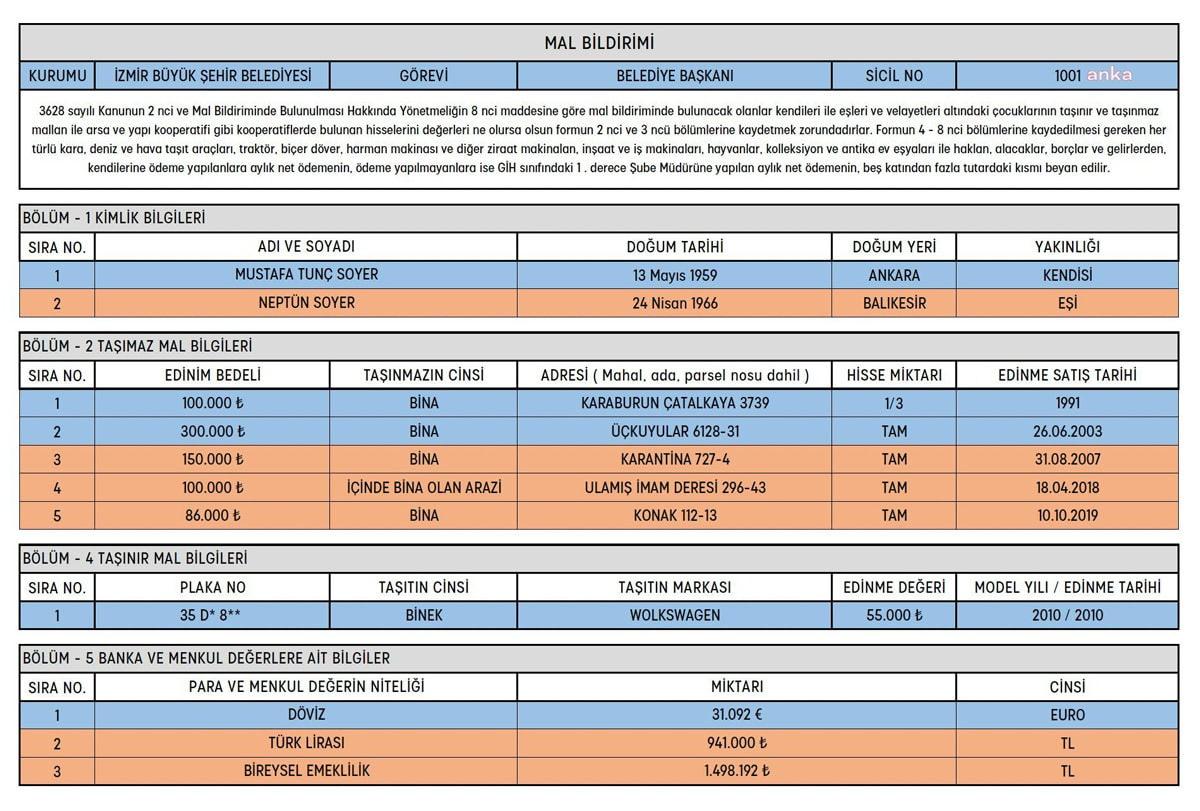İzmir Büyükşehir Belediye Başkanı Tunç Soyer, sosyal medya hesabından, “Mal varlığı beyanım. Kamuoyuna saygılarımla” notuyla kendisi ve eşi Neptün Soyer’e ait mal varlığını açıkladı.