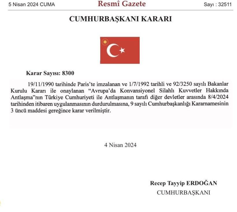 Resmi Gazete’de dün yayımlanan 8300 sayılı Cumhurbaşkanlığı kararı sosyal medyanın dikkatini çekti. NATO ülkelerinin soğuk savaş döneminde imzaladığı Avrupa Konvansiyonel Silahlı Kuvvetler Antlaşması (AKKA) için Türkiye durdurma kararı yayımlandı.