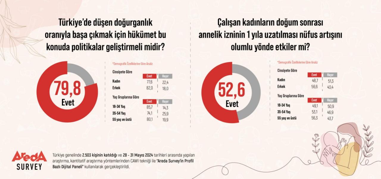 Areda’nın “Türkiye’de düşen doğurganlık oranıyla başa çıkmak için hükümet bu konuda politikalar geliştirmeli midir?” sorusuna yüzde 79,8 oranıyla ‘evet’ cevabı verildi.