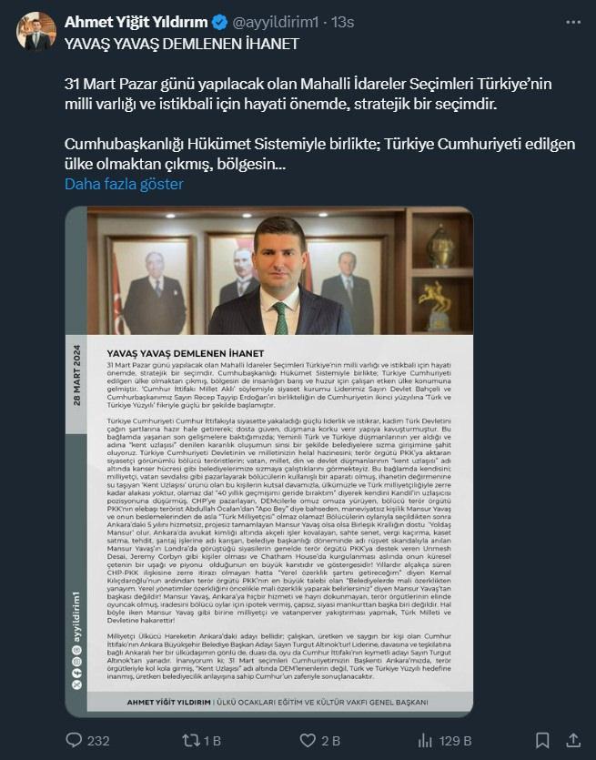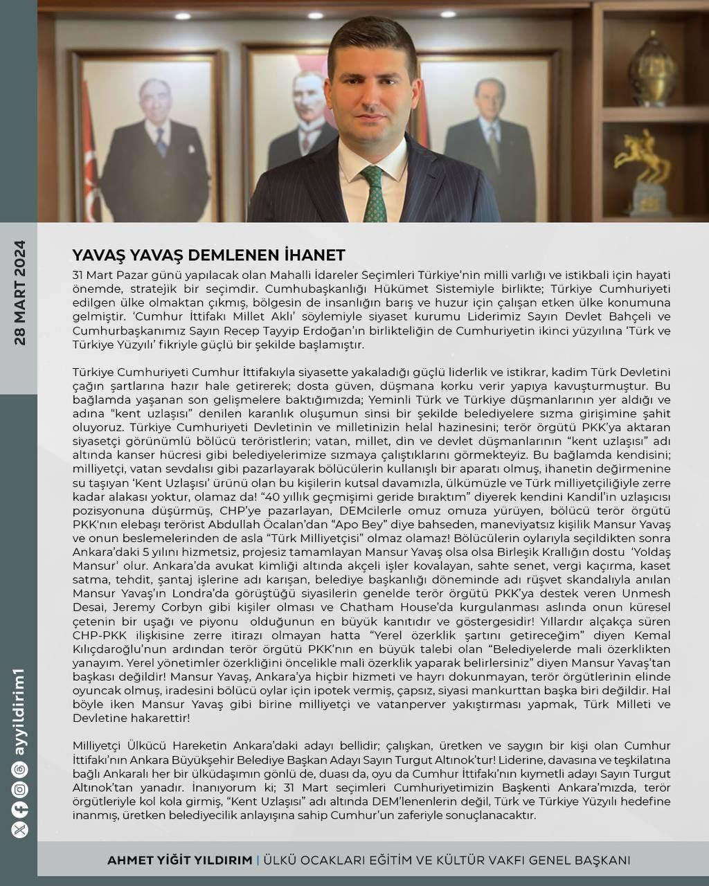 Ülkü Ocakları Eğitim ve Kültür Vakfı Ahmet Yiğit Yıldırım, Ankara seçimleri ile ilgili bir yazı paylaşarak Mansur Yavaş’a tepki gösterdi.