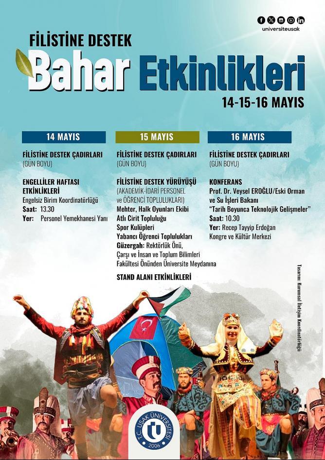 Uşak Üniversitesi, 14-16 Mayıs tarihleri arasında düzenleyeceği etkinliklerle toplumsal farkındalığı artırmayı ve anlamlı bir bahar atmosferi oluşturmayı hedefliyor. Bu yılın teması “Filistin’e Destek/Bahar Etkinlikleri” olarak belirlendi.